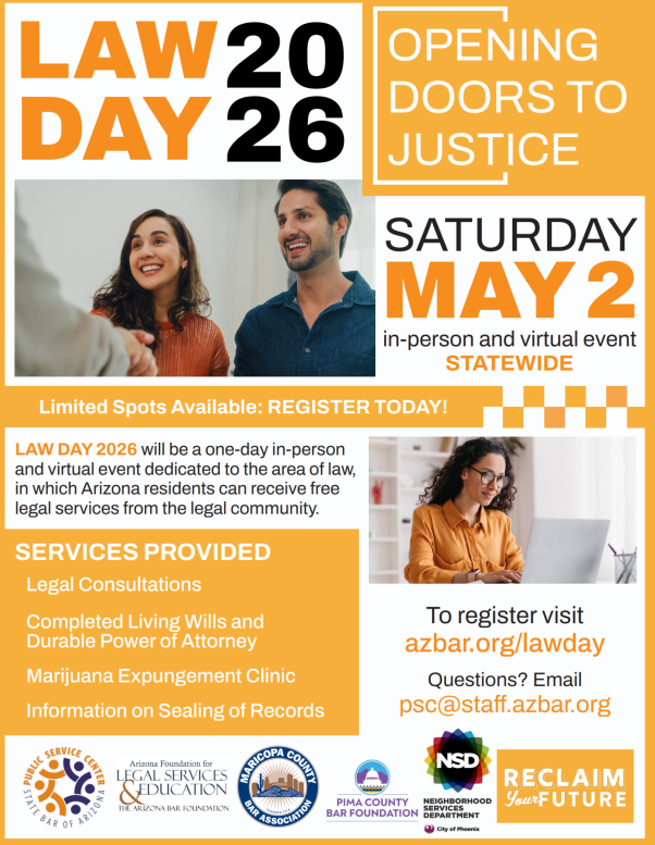 Every year, the State Bar of Arizona’s Public Service Center celebrates Law Day with a free legal clinic dedicated to helping Arizonan’s access legal services. They are providing pro bono (no cost) legal help to residents. This year, they are putting on a hybrid event allowing community members to meet with volunteer legal professionals at their Phoenix office located at 4201 N 24th Street Phoenix Az 85016 or virtually on Zoom on Saturday, May 2.  Please register in advance since spots are likely to fill up. All are welcome.